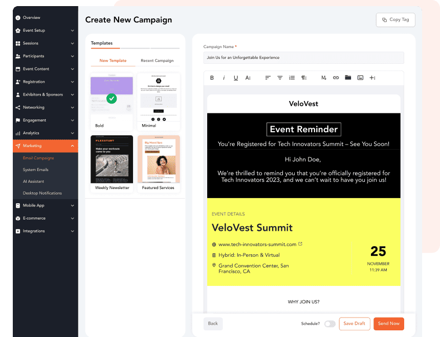 • Engage attendees with personalized emails on event updates, reminders, and post-event follow-ups.