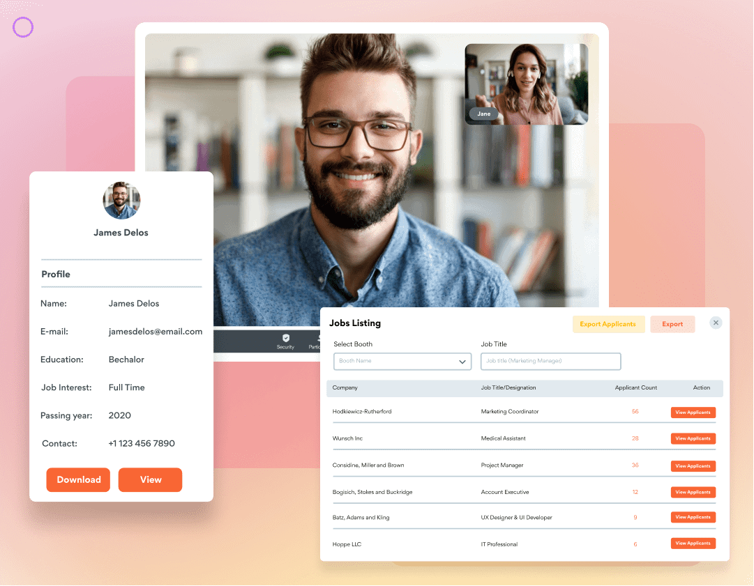 Add open roles and job descriptions to each exhibit booth. Candidates can directly apply to the jobs when they visit the booth. Recruiters can also add resources such as perks and benefits brochures and employee testimonial videos to their booths.